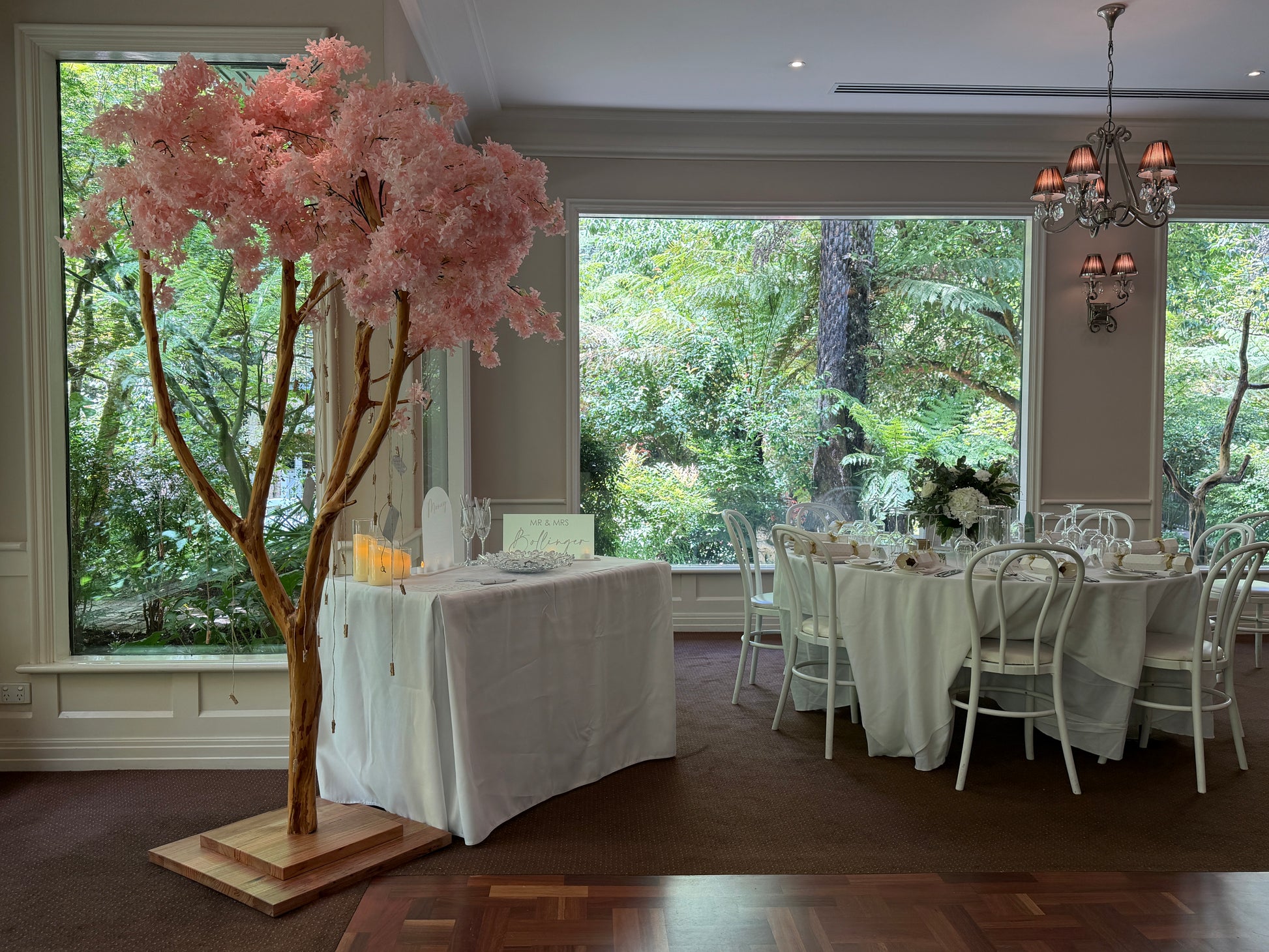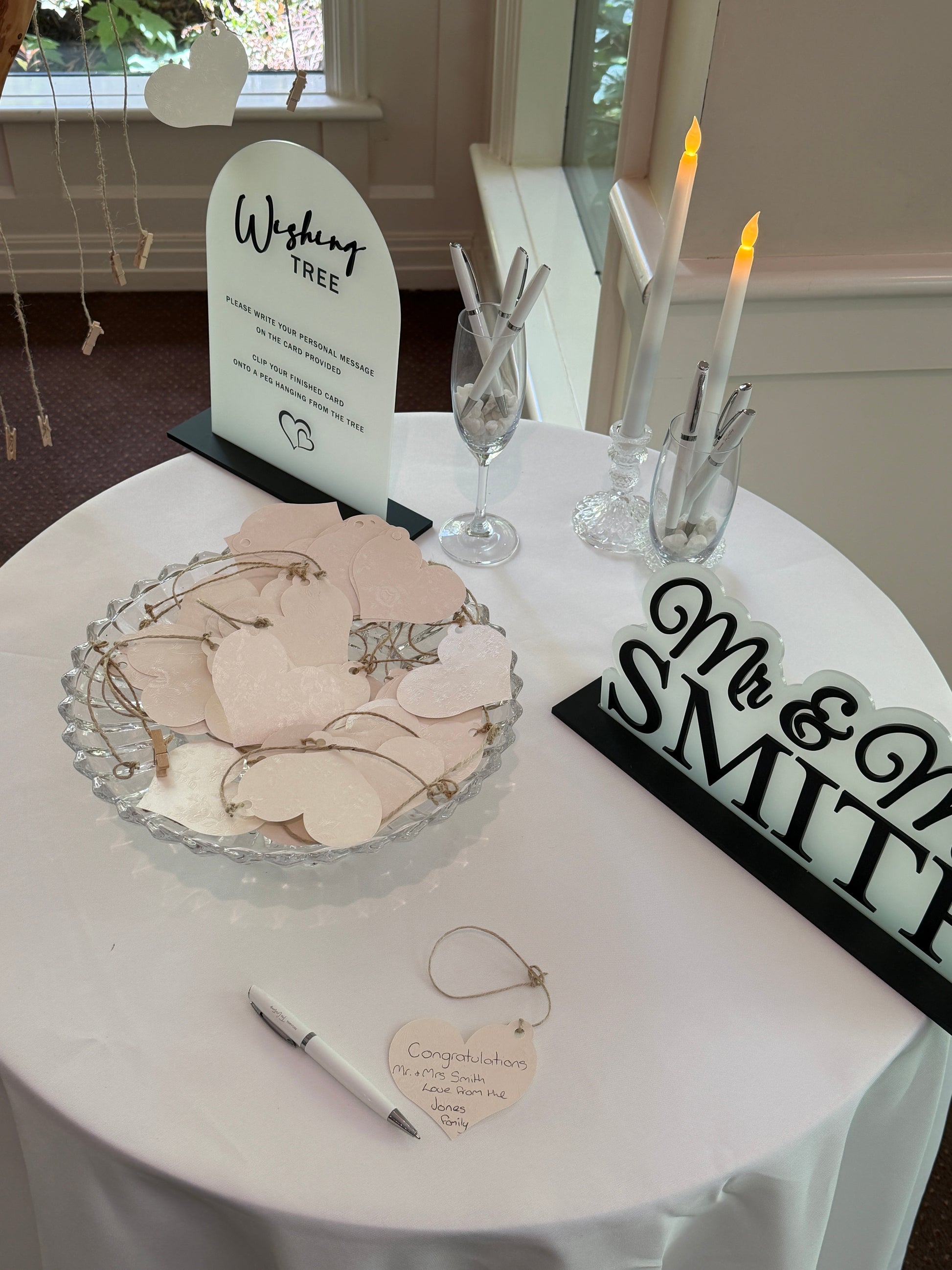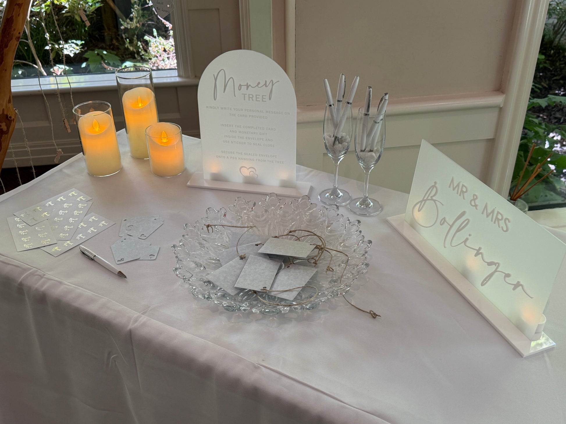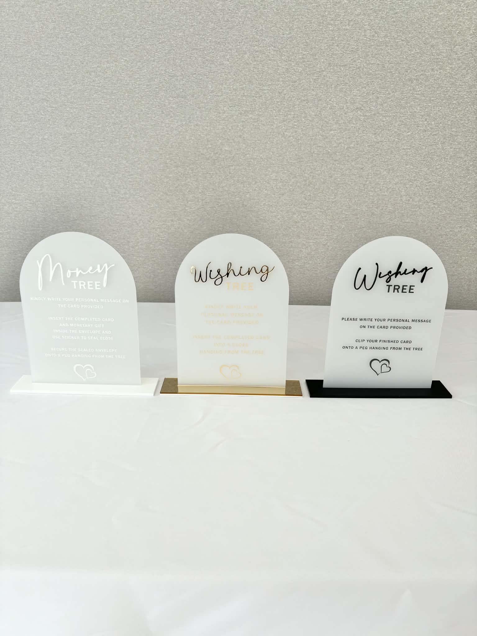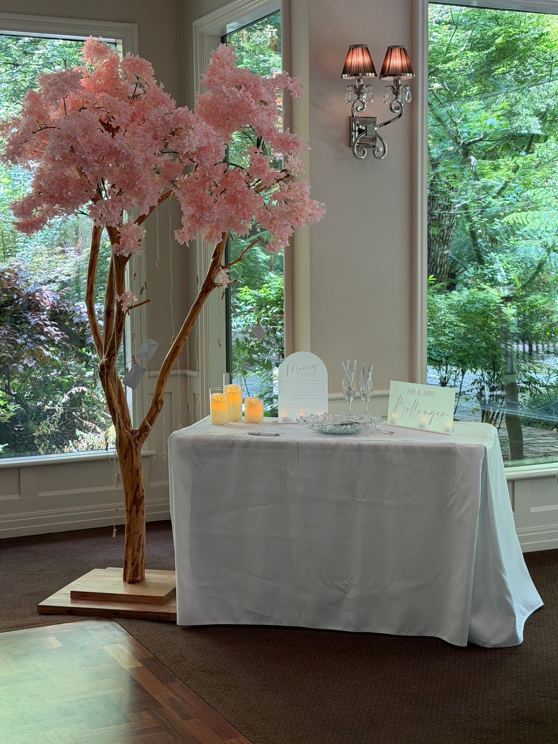 - We provide and set up beside the tree: your choice of a circle or rectangle table with tablecloth of your chosen colour. We set up on the table with the provided cards (and envelopes if money tree).